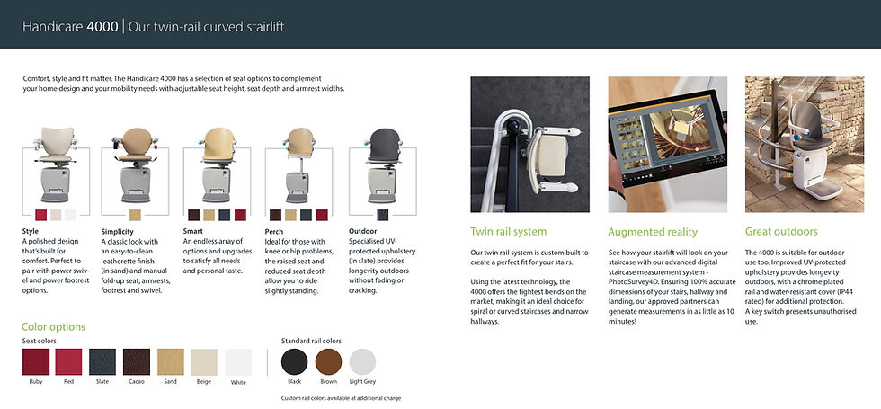 The Handicare 4000 is available in a wide range of seat styles and colour options, allowing you to tailor the stairlift to suite your home décor and personal preferences.